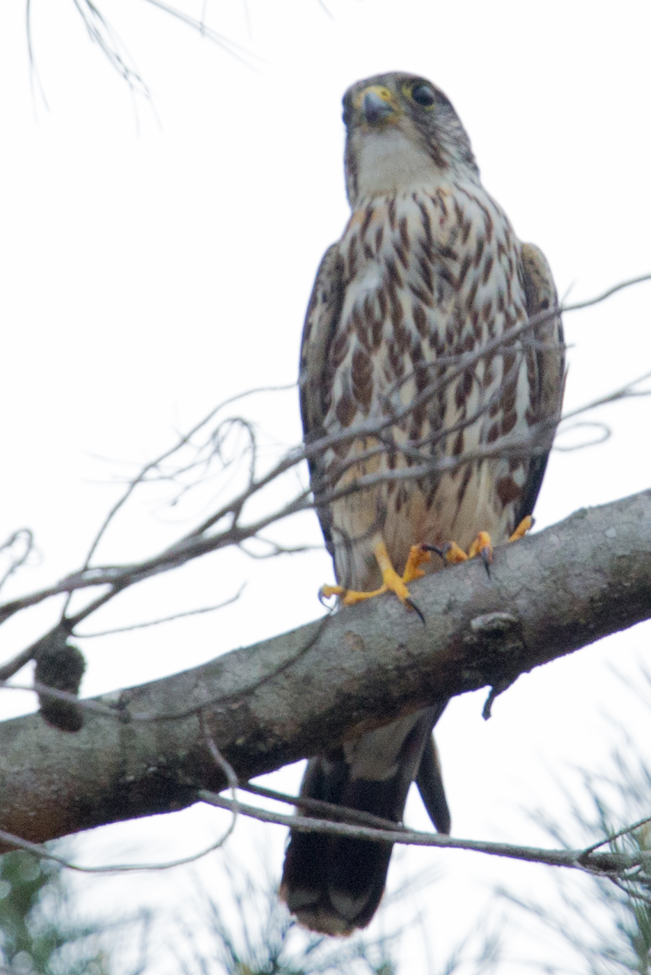 But in the recently cleared north field where the warblers usually work the conifers, it was strangely quiet and I wondered about the lack of small bird business there. Then I saw her, the merlin, in a low pine branch not more than 50 feet from me. The warblers knew she was there, that’s why they were elsewhere. I took a quick shot with the 200 millimeter in the overcast light and checked my exposure.